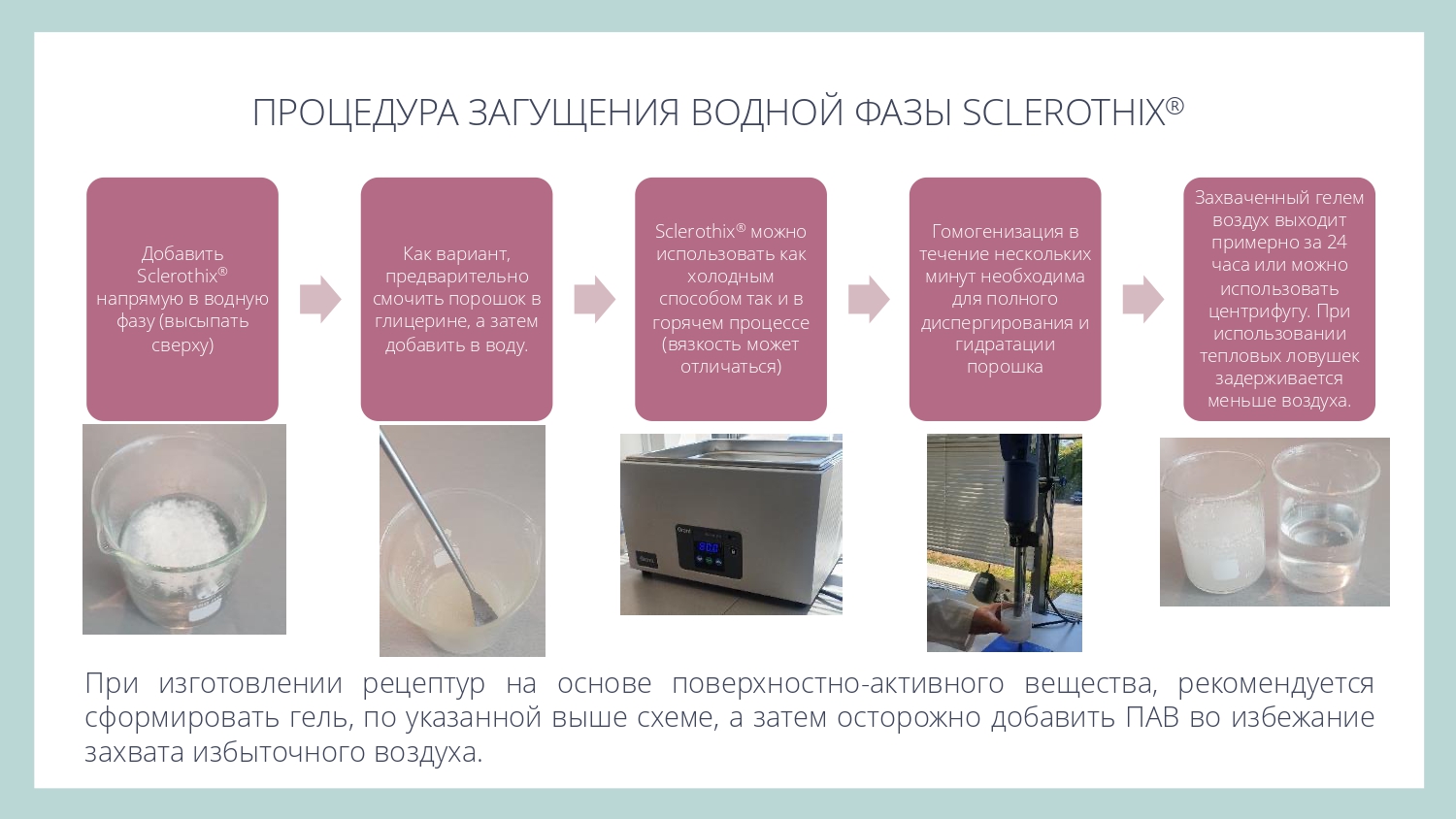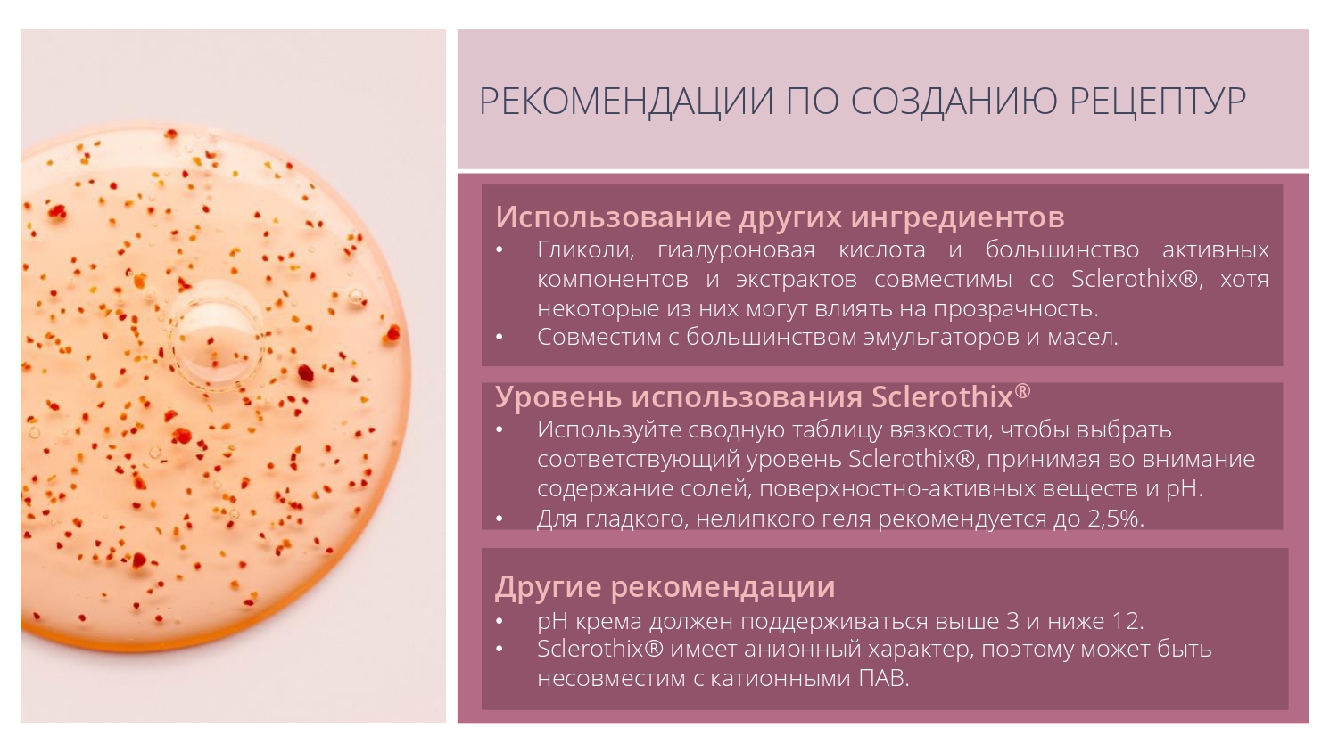 Sclerothix является эффективной добавкой для улучшения суспендирования (подвешивания) различных частиц - скрабов, глин или пигментов, в том числе в составе моющих систем.